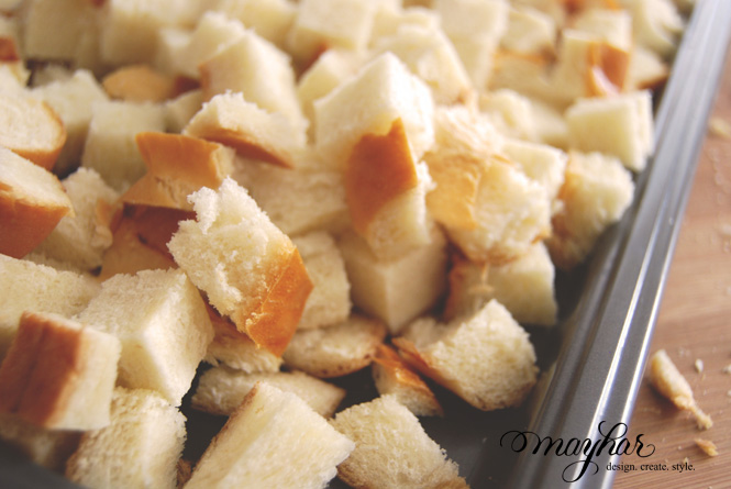 Preheat the oven to 350 degrees fahrenheit. Lightly butter a 9×13″ baking dish and set aside. Place the bread cubes on a rimmed baking sheet and toast until golden grown; set aside. In a large bowl, mix together the eggs, cream, sugar, pumpkin and spices. Slowly add the bread to the mixture, allowing it to absorb the liquid (do not stir the bread into mush). When the bread is saturated, place the mixture into the prepared baking dish. Cover with foil and bake for 20 minutes. Uncover and bake for 10 to 15 more minutes until crisp and brown.